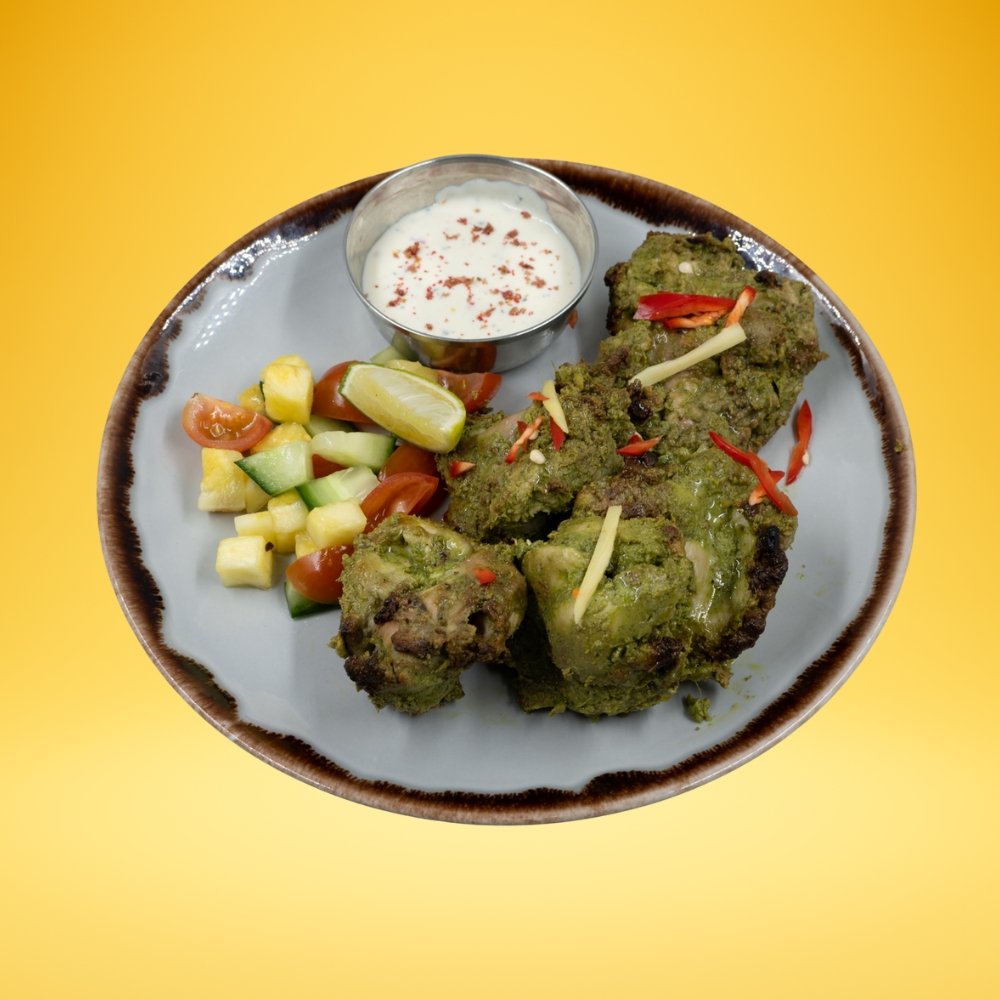 Boneless Chicken thighs marinated with yogurt, mixed spices & Green herbs Chargrilled in Tandoor. Served with salad & herb chutney.