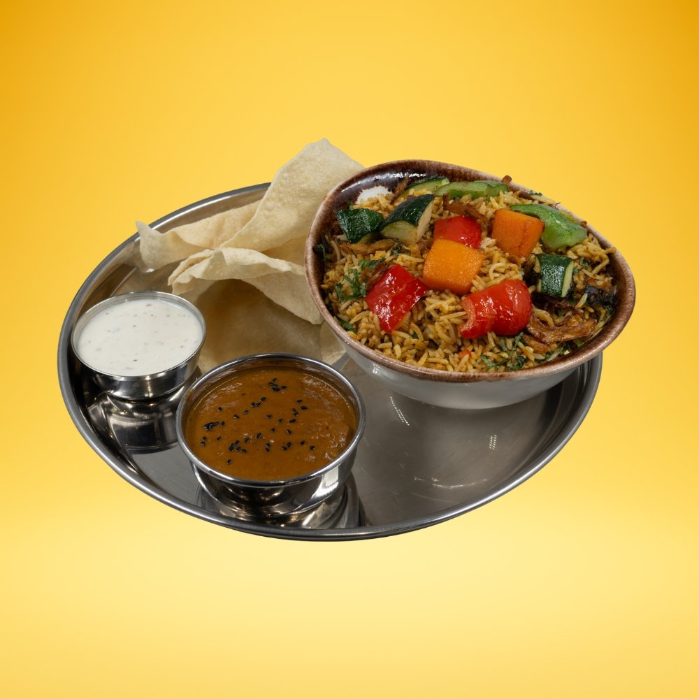 Veg Mughlai Biryani cooked with layers of Rice, Mild, Homemade Spices, Mix Veggies & Dry Fruits.